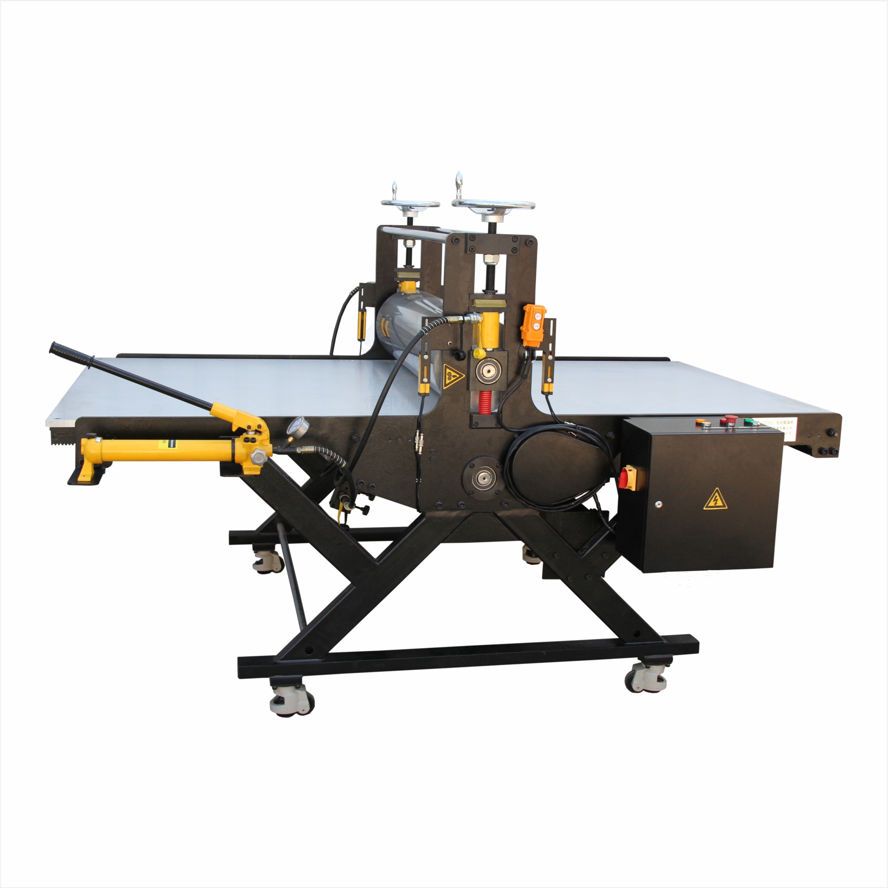 | YJ-08系列液壓型大幅面版畫機為結合現代制造技術,使用CNC設備加工的大尺寸專業型版畫機,用于高品質銅版、木版等版畫印制,也可以做平印。 ● 采用精磨大直徑動平衡加工的高精度滾筒,精密齒輪齒條傳動。 ● 主體墻板為一體化整體鋼板結構,表面為靜電噴涂。 ● 版床為高強度鋁合金材質。 ● 液壓泵同步施壓,壓力均勻,可數據化調整。 ● 使用高承載腳輪,可以調平衡,鎖緊固定,方便移動。 兩種施壓形式: 1) 使用手動液壓泵,兩端同步最大可達十噸的液壓缸平衡施壓并顯示壓力; 2) 不使用液壓系統或液壓系統故障狀態下使用手輪施加壓力。 |